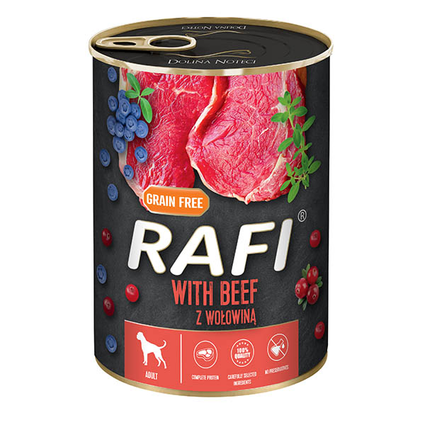 שימורים פטה ראפי לכלב בטעם בקר, מועשר באוכמניות וחמוציות 400 גרם,